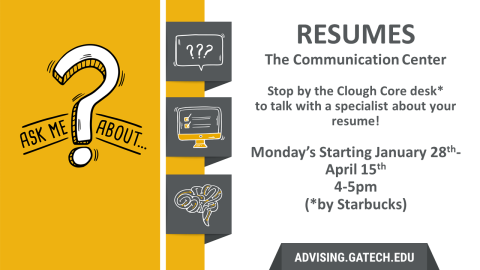 Stop by the Clough Core desk across from Starbucks to receive helpful tips in building your resume!