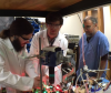 In the CHAOS lab, Flavio Fenton (from right) looks on as Tim Farmer and Conner Herndon perform simultaneous optical mapping of voltage and calcium signals from a zebra fish heart.