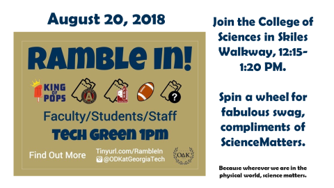 The College of Sciences joins the rest of Georgia Tech in Ramble In, a first-day-of-class fun event organized by Omicron Delta Kappa.